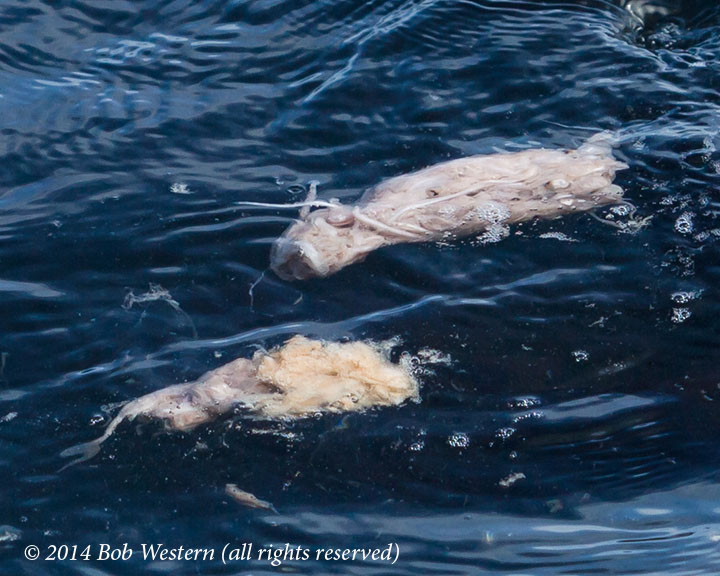 California sea lions, Zalophus californianus, regurgiated "pellets," are quickly set upon by sea gulls.
