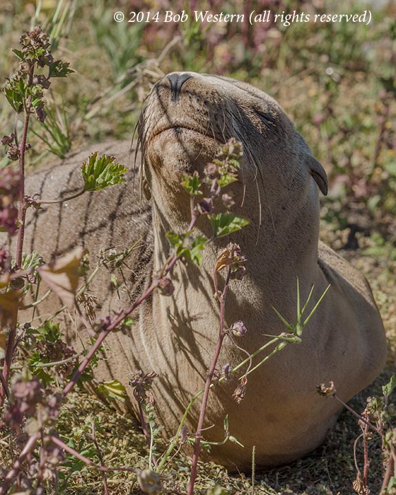 A yearling California sea lion, Zalophus californianus, that climbed into the weeds, Monterey, CA.