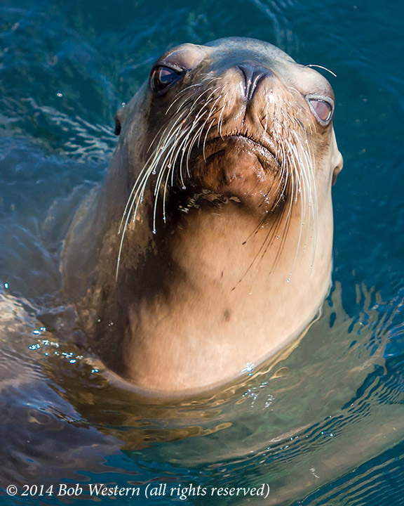 California sea lions, Zalophus californianus, sense their surroundings through large eyes, and sensitive wiskers, Monterey, CA.