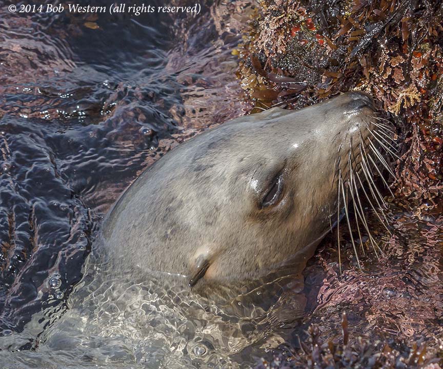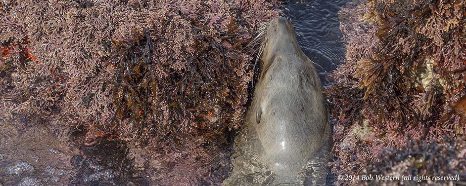 A California sea lion, Zalophus californianus, resting on a bed of corraline algae, Monterey, CA.