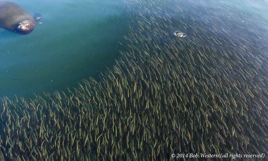 A school of anchovies keeping a security perimeter from a California sea lion, Zalophus californianus, Monterey, CA.