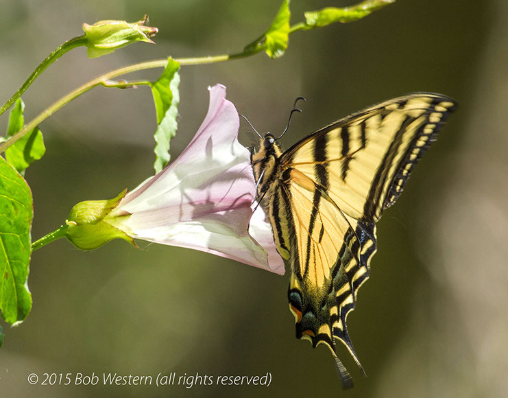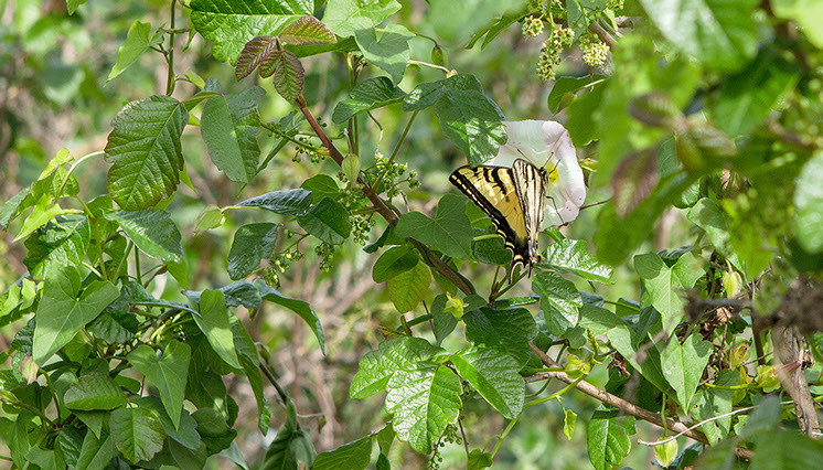 The Swallowtail Butterfly, Papilio [Pterourus] multicaudata, on Morning Glory, in poison oak, near the Carmel River lagoon, CA.