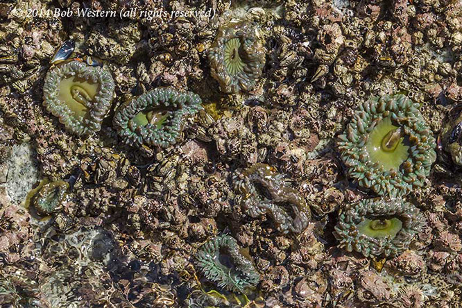 Anthopleura elegantisimma, anemones, & barnacles, Tetraclita rubescens.