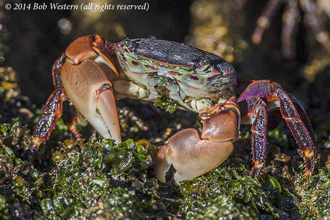 The Lined Shore Crab, Pachygrapsus crassipes, eating green algae, Monterey Bay.