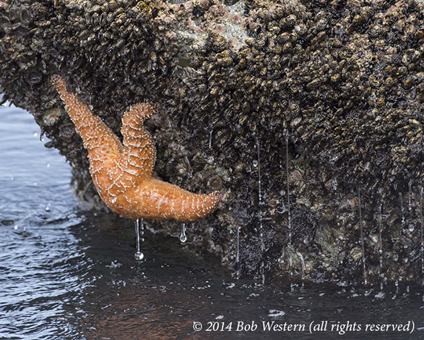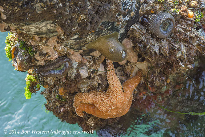 The Orchre Sea Star, Pisaster ochraceus, and anemones, Anthopleura elegantissima.