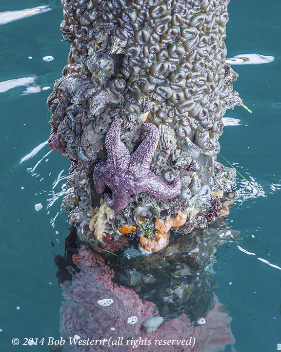 Typical marine life on a wharf piling, Wharf #2, Monterey Harbor.