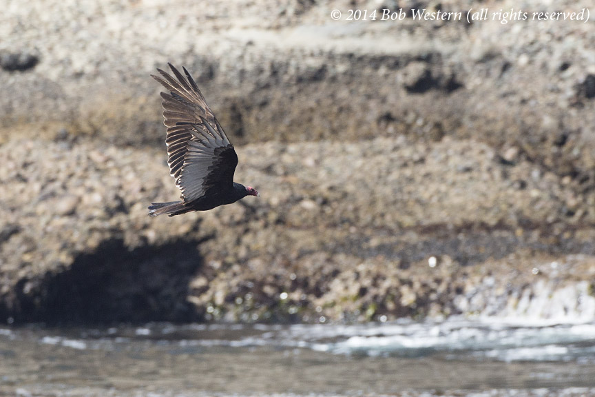 A Turkey Vulture, Cathartes aura, cruising over kelp beds for dead sea lions, Point Lobos State Reserve, CA.