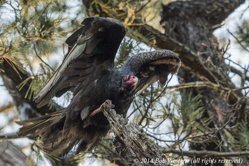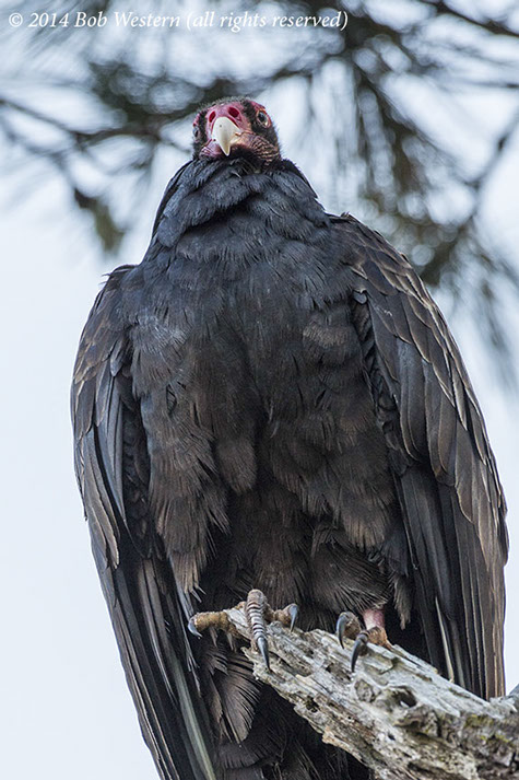 A Turkey Vulture, Cathartes aura, in a Monterey Pine, Point Lobos State Reserve, CA.