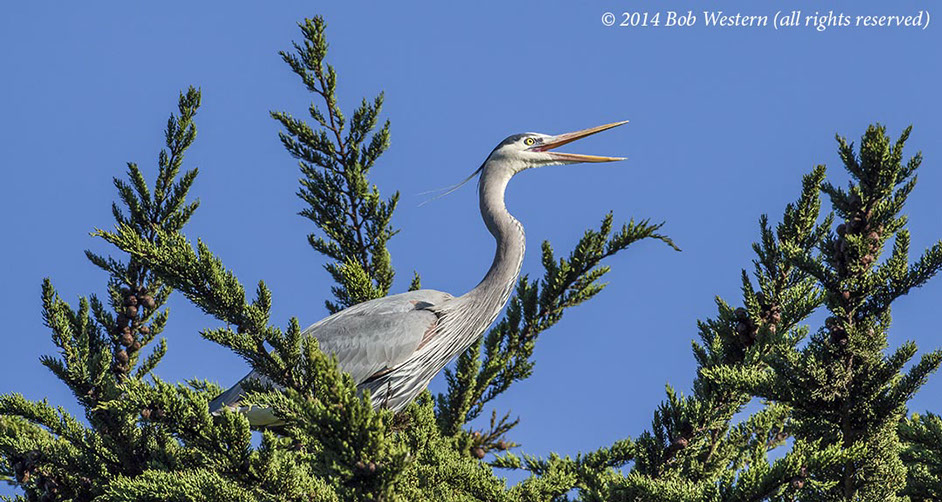 Great Blue Herons, on a Monterey Cypress, part of a flock of 25 seen heading south to nesting grounds, Monterey, CA.