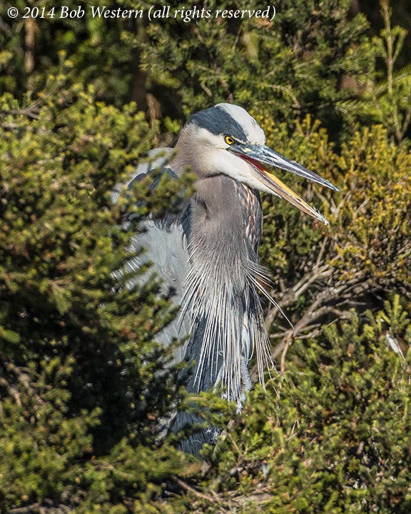 A Great Blue Heron, Ardea herodias, in Monterey Cypress, Monterey, CA.