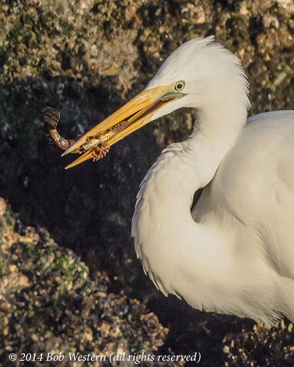 A Great Egret, Ardea alba, with a kelpfish, Monterey, CA.