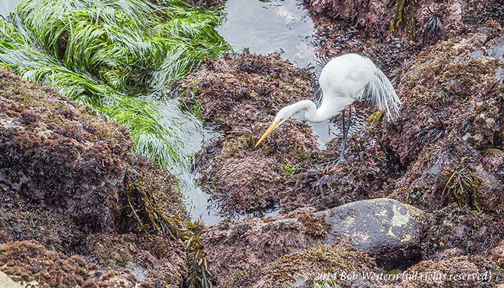 A Great Egret, Ardea alba, hunting in the intertidal zone, Pacific Grove, CA.