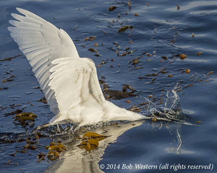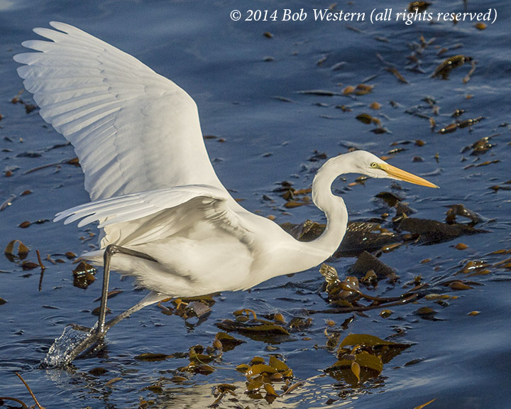 A Great Egret, Ardea alba, hunting in a kelp bed off San Carlos Beach, Monterey, CA.