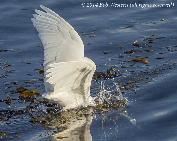 A Great Egret, Ardea alba, striking prey, in a kelp bed off San Carlos Beach, Monterey, CA.