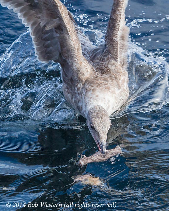 California sea lions, Zalophus californianus, regurgiated "pellets," are quickly set upon by sea gulls.