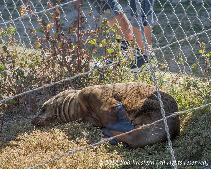A yearling California sea lion, Zalophus californianus, fenced-off from the public, Monterey, CA.