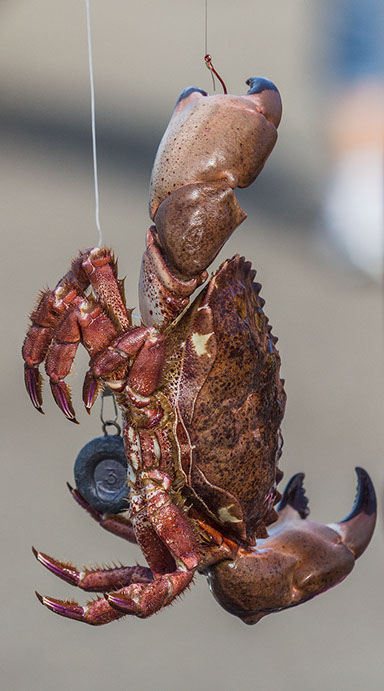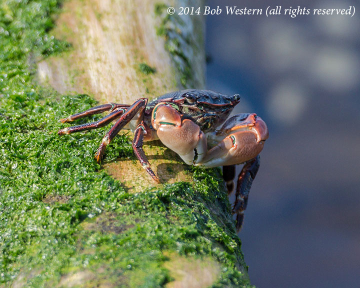 The Lined Shore Crab, Pachygrapsus crassipes, eating green algae, Monterey Bay.