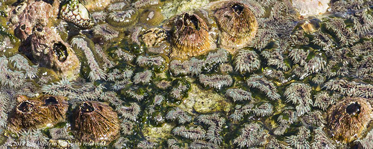 Anthopleura elegantisimma, anemones, & barnacles, Tetraclita rubescens.