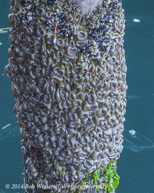 Typical marine life on a wharf piling, Wharf #2, Monterey Harbor.