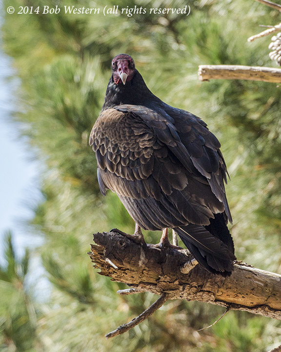 A Turkey Vulture, Cathartes aura, in a Monterey Pine, Point Lobos State Reserve, CA.