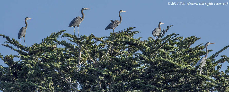 Great Blue Herons, on a Monterey Cypress, part of a flock of 25 seen heading south to nesting grounds, Monterey, CA.