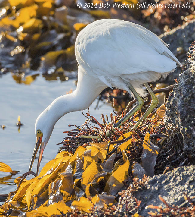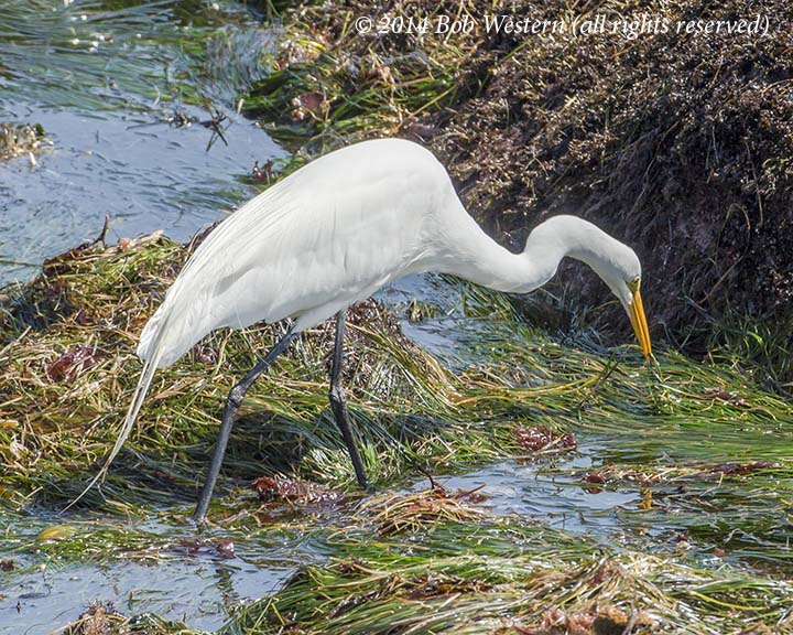 A Great Egret, Ardea alba, hunting in a kelp bed off San Carlos Beach, Monterey, CA.