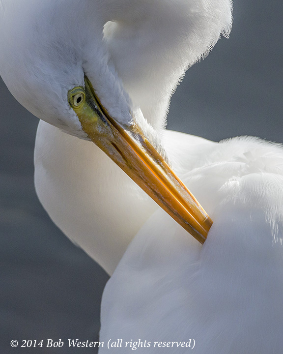 A Great Egret, Ardea alba, preening, Monterey, CA.