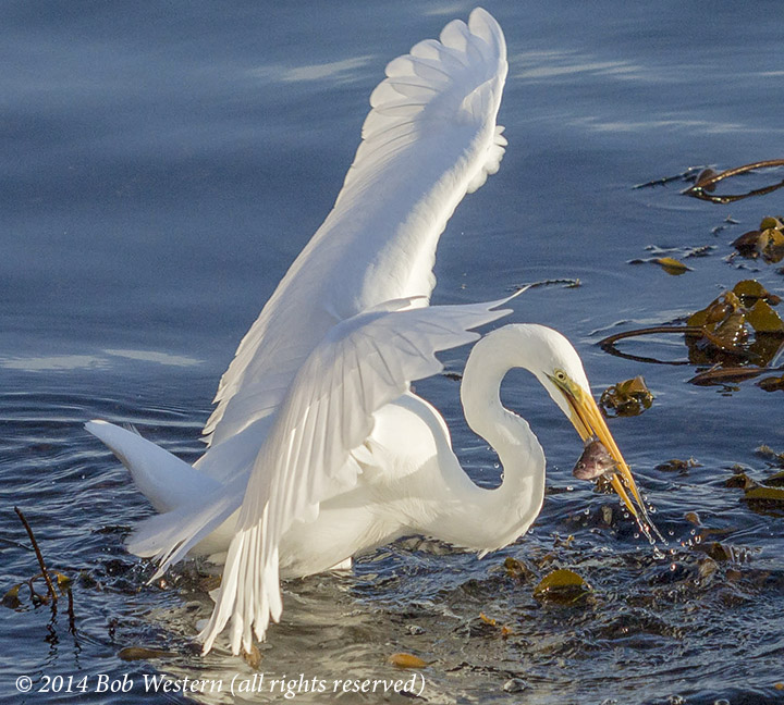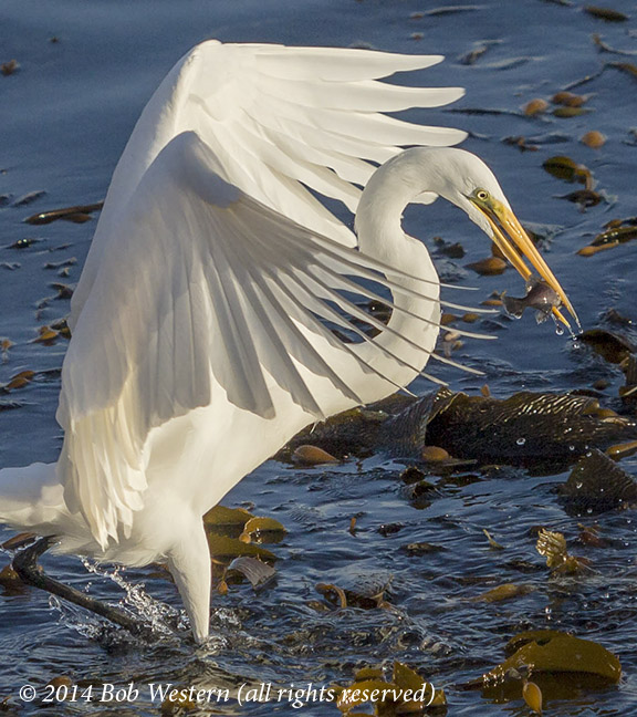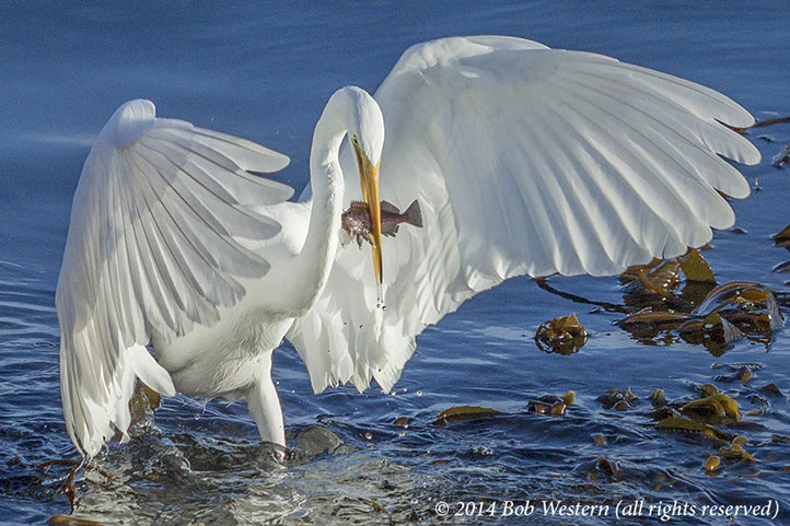 A Great Egret, Ardea alba, with a kelpfish, Monterey, CA.