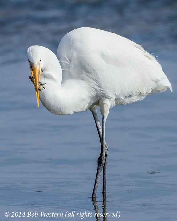 A Great Egret, Ardea alba, with a Lined Shore Crab, Moss Landing, CA.